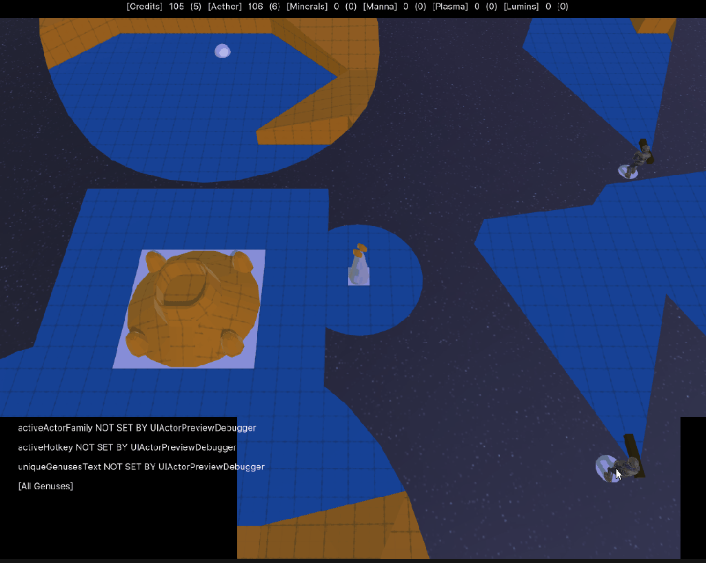 In the lore, the player’s universe was closing towards its heat death and all useful resources in it were nearly depleted. As the commander of a mining colony you were tasked with crossing dimensional rifts appearing in asteroid belts to gather the abundant resources in the Xenos’ dimension. Functionally at this point the player’s universe really only served as FOW and an opportunity to experiment with stencil shaders. There was however something contextually relevant that playtesting would reveal to have more gameplay value, improve both the early game and reinforce the value of the vision as a resource. Asteroids.