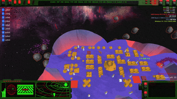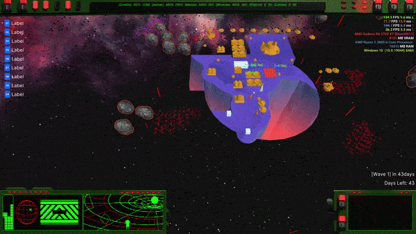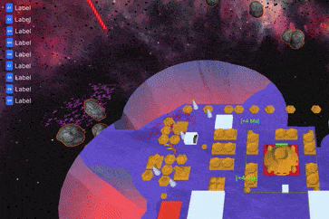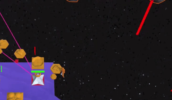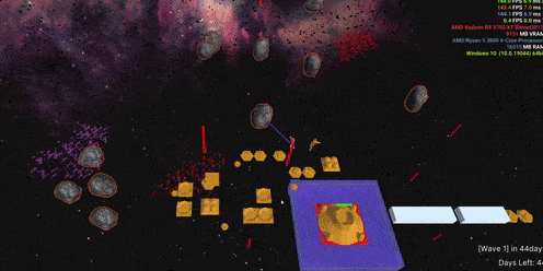 Up till now asteroids were just cosmic set dressing, but they could be more. They existed only in the player’s universe, had no collision detection and disappeared as the Xeno universe was revealed. If they were to become collidable gameobjects that could move and inflict damage upon touch, they’d provide a predictable but not overpowered threat to base expansion. In the mid game they could be tuned for balancing difficulty and by the late game they’d practically disappear behind the alien universe whilst the player focused on the escalating waves of Xenos.